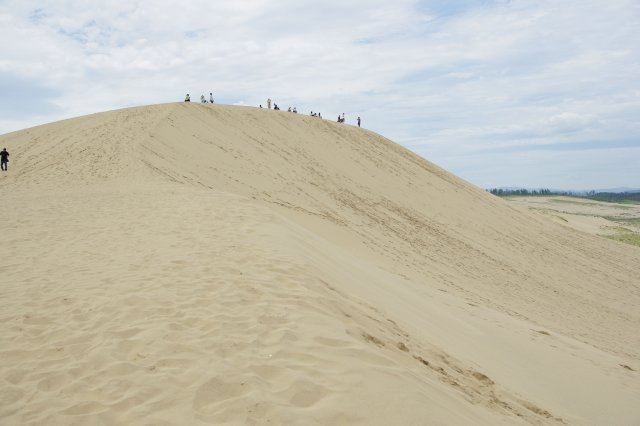 砂丘会館がある入口から入って正面に見える大きな砂の丘が第二砂丘列(通称:馬の背)になります。この馬の背と言えば、2年前に某大学のサークルが落書きをしたことでニュースにもなりましたが。。。この鳥取砂丘は国立公園でもあり天然記念物でもあるらしく、落書きもさることながら砂の持ち帰りも禁止されています。でも、あれもこれもダメなのかと言うと、そうではないようで、ハングライダーやパラグライダー、スノボーの砂版であるサンドボードが出来たりもします。砂を持ち帰りたい場合はお土産屋に売っているようだし(金になるなら良いのだろうか。。。)。ま、景観を壊さない程度であれば容認しているようですね。さてさて、馬の背を見たオイラは馬の背の正面から砂頂を目指してみる事にしました。遠くから見ていると「こんな高さすぐだろう」って思ったのですが、近ずくにつれて結構な高さでして(;^^)