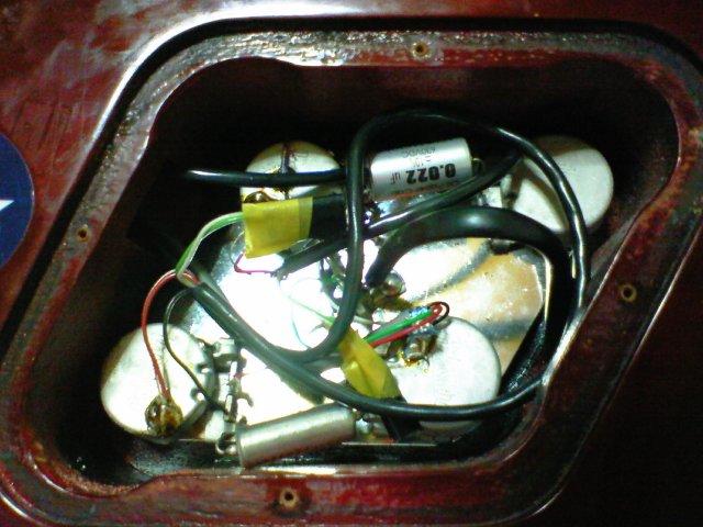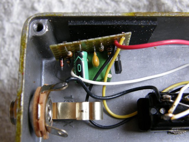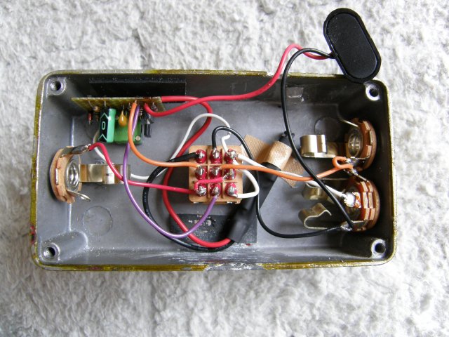 真ん中にあるのがフットスイッチ。その下が前の日記に書いたLP Specialに突っ込んだオレンジ・ドロップ。周りの線材は今回のエフェクター用のベルデンの配線材。LEDは写っていませんが、MINIに使った青色LEDが残っているのでそれを使用。12V用に仕上げてあるLEDですが、エフェクターは9V電源なので余裕のよっちゃんですね。