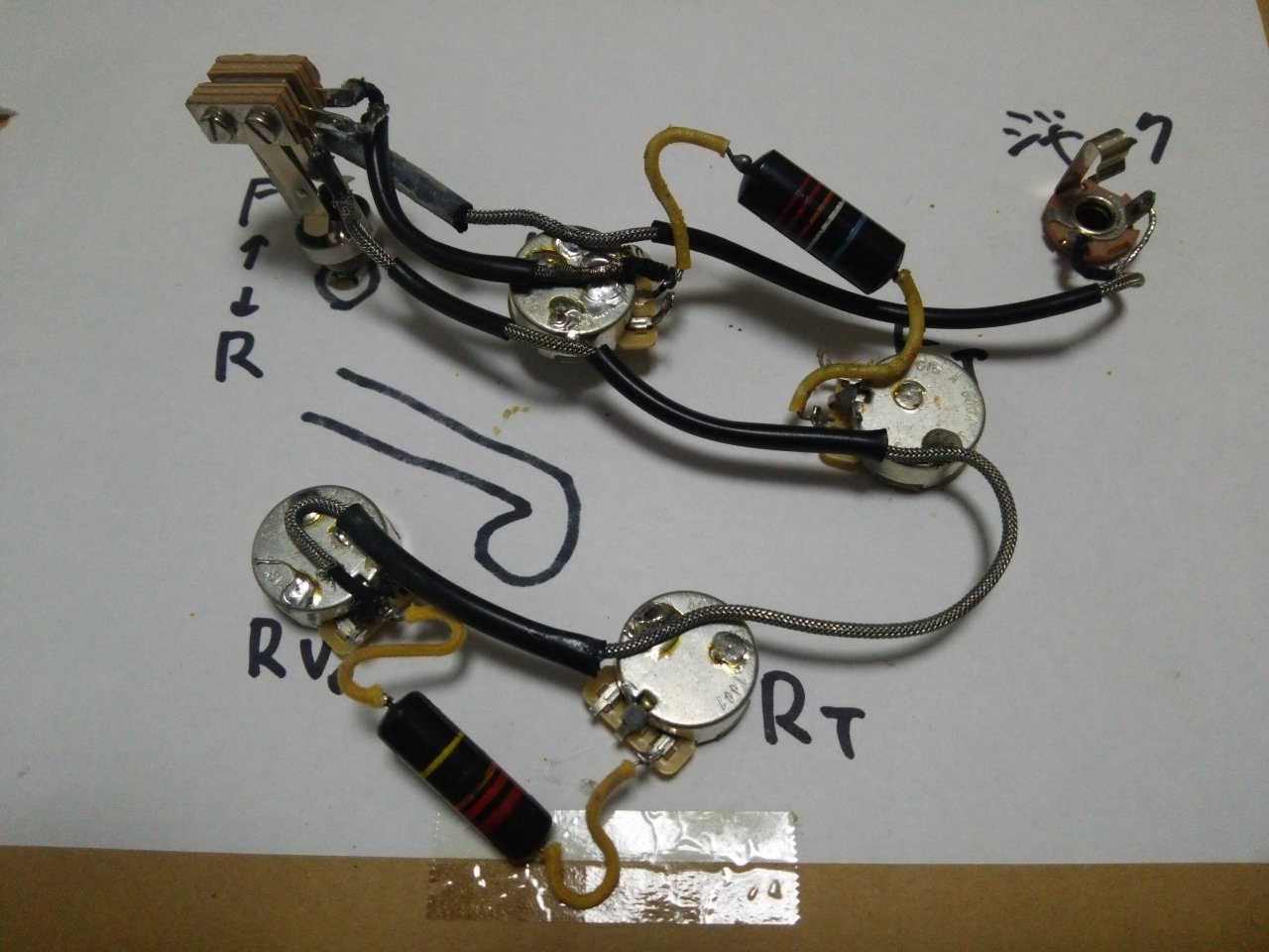 よくよく見て行くと、ピックアップカバーははんだが取れてカパカパ動き、配線は継ぎ足され、コンデンサの足は根元から折れててはんだし直されており、どう見ても素人作業炸裂な状態でした。