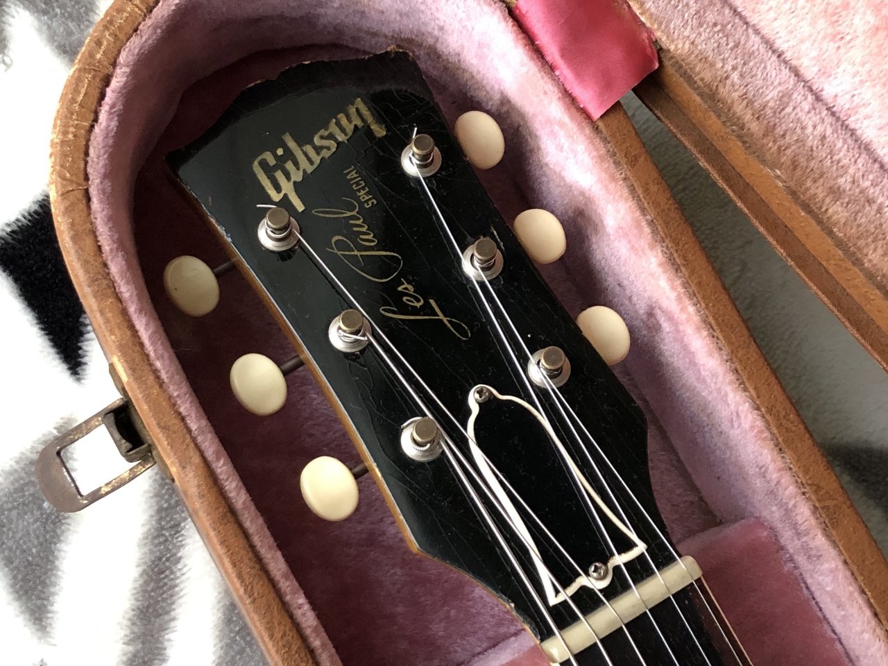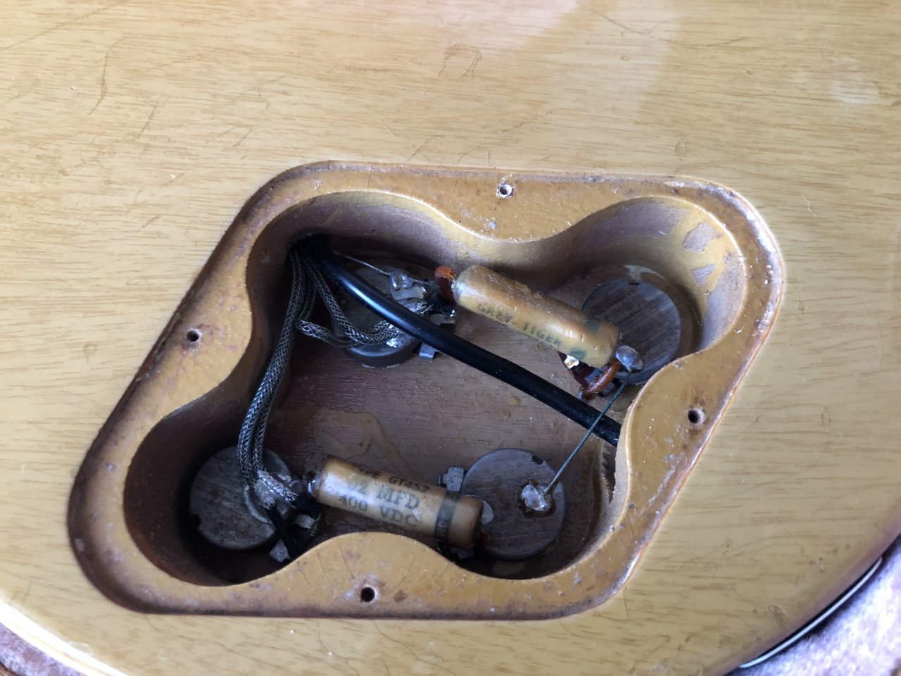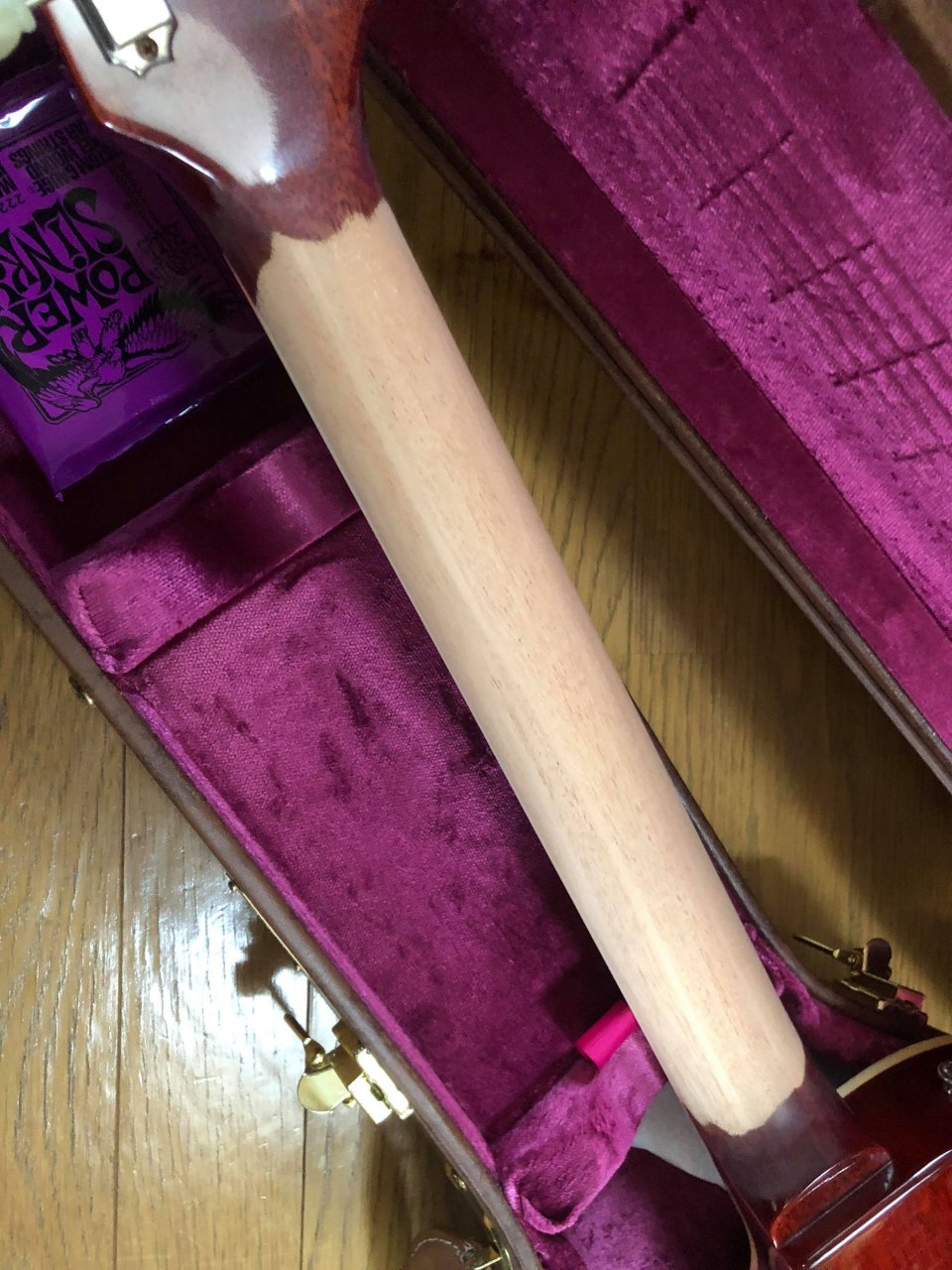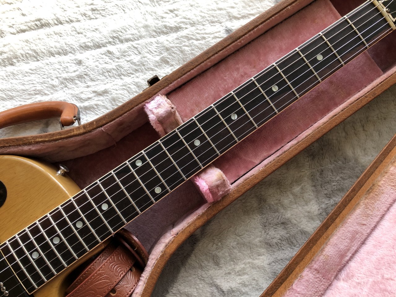 安く出されているので、ネック折れやパーツ交換などあるのかなと思っていましたが、ペグがシュリンクしているために60年代の物に交換されている(シュリンクしているペグはちゃんと保管してある)・リフレット・リナット以外はオリジナルのままでした。