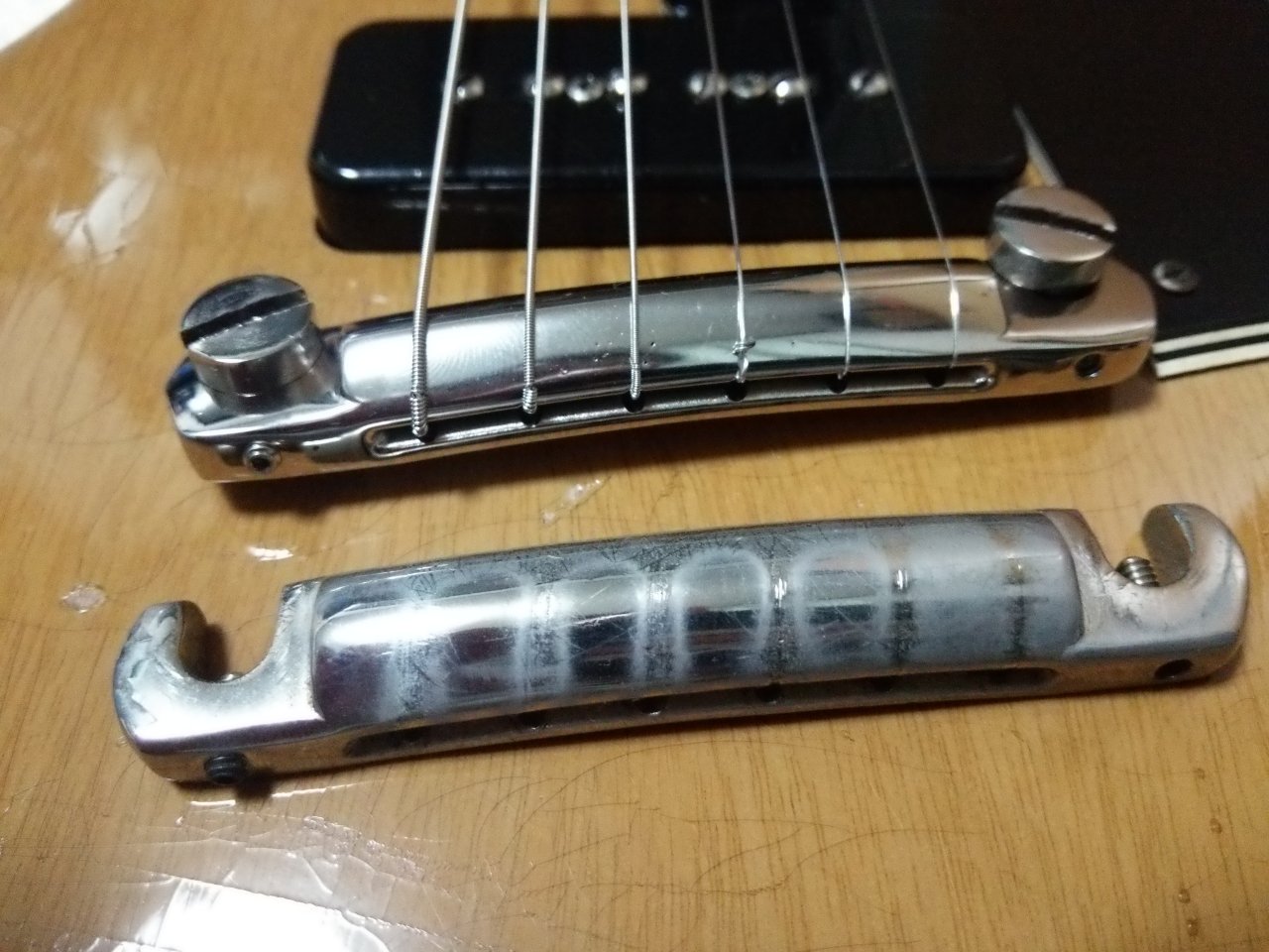 ブリッジのメッキが剥げて弦の当たりが付いていて(60年以上使われてきた爪痕ですね)、ミョーンと変な鳴りをしていたのでブリッジをリプレイス。さらに、フレットがペッタペッタだったのでリフレット・リナットを行い、実践投入してゴキゲンなサウンドを掻き鳴らしています。