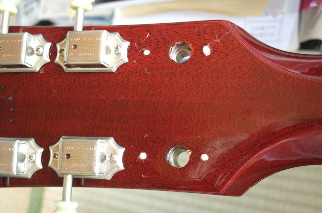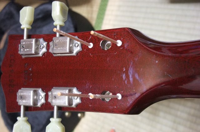 配線交換の前に、ペグなどのネジ部分を増し締めしたのですが、なんとも1弦と6弦のペグのネジがガバガバなんです。なので、楊枝で穴埋めして穴あけ直ししました。