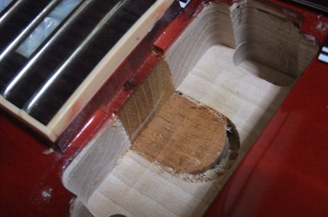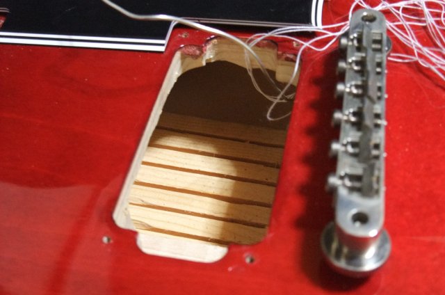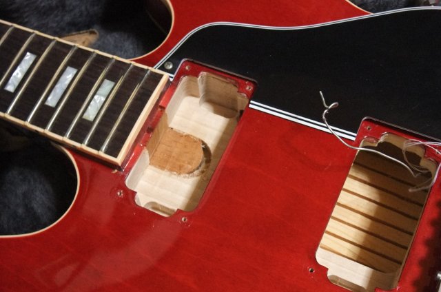 こうなると仕方ないので、リアピックアップのザグリ部分から引っ張り出します。ES-335は、60年代からリアピックアップのセンターブロック一部がばっくりと開いているんですが、これがちゃんと再現されていました。ちなみに、50年代のモノは、ビッチリ塞がっている状態です。