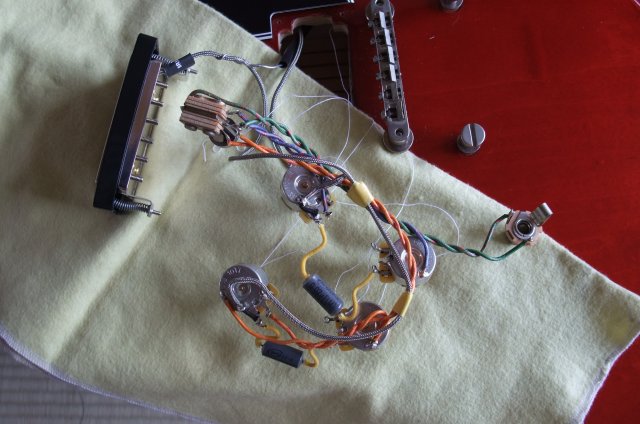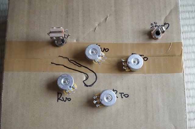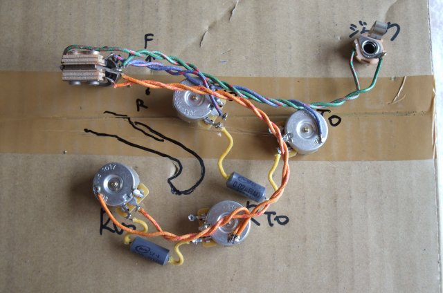 こんな感じになるんですが、ボリューム/トーンの穴から出ている紐は、あとで組み直す時にポットをつけて引っ張ってくる為のものです。裏が開くわけではないし、手も入らないのでガイドが必要って訳です。
