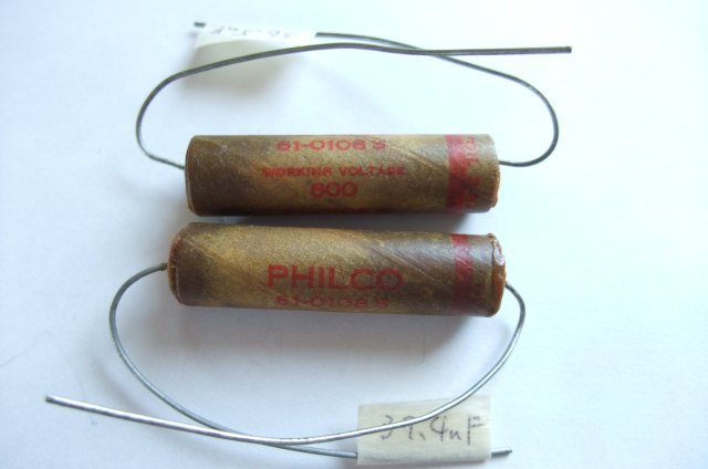 ワックスモールドのコンデンサです。ワックスモールドと言えば、Gibson社が50年代に使っていたグレイ・タイガーが有名ですね。このPHILCOのワックスモールドも50年代のものであります。